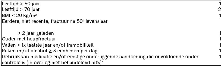 Ad 3: Bij cliënten ≥ 60 jaar zonder recente fractuur en zonder gebruik van glucocorticoïden wordt de risicofactoren scorelijst aanbevolen om in te schatten of aanvullend onderzoek geïndiceerd is. De risicofactoren scorelijst is als volgt: