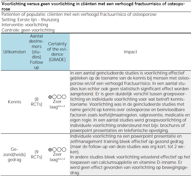 Tabel 6.1. Summary of findings – voorlichting* bij cliënten met een verhoogd fractuurrisico of osteoporose