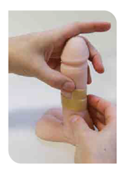 Hoewel het gebruik van fixatiemateriaal dat aan de buitenzijde van de externe katheter bevestigd wordt, het verwijderen van de externe katheter vergemakkelijkt en intermitterende katheterisatie mogelijk maakt, biedt het minder zekerheid dan gebruik van kleefmateriaal tussen de huid en de katheter.