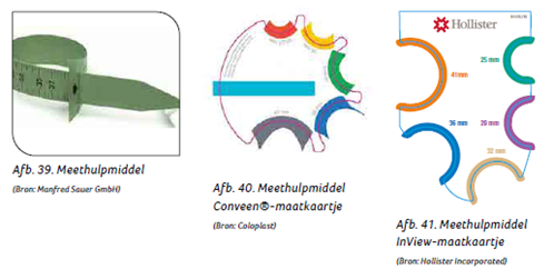 Om de juiste maat van de externe katheter te kunnen bepalen moet de omtrek van de penis worden opgemeten. De maat dient te worden gebaseerd op het gedeelte van de penisschacht waar de diameter het grootst is . De cliënt dient tijdens de meting op de rand van een bed of stoel te zitten, met zijn benen een stukje uit elkaar. Bij deze zithouding is te zien hoe het scrotum en de penis van nature gepositioneerd zijn en kan het nauwkeurigste meetresultaat verkregen worden. Als het meetresultaat tussen twee kathetermaten in valt, kan het lastig zijn om vast te stellen welke maat externe katheter het meest geschikt is. In dat geval dient de cliënt beide maten thuis te testen. Het materiaal waarvan externe katheters gemaakt zijn is soepel genoeg om goed aan te sluiten zonder te strak te zitten. Om te helpen bepalen welke maat veilig en comfortabel te gebruiken is voor een specifieke cliënt, bieden fabrikanten en leveranciers van externe katheters meethulpmiddelen aan (zoals een kartonnen maatkaartje of sjabloon) . De gehanteerde maten kunnen echter per fabrikant verschillen en daarom dient altijd het meethulpmiddel van de betreffende fabrikant te worden gebruikt.