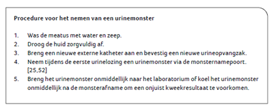 Bij hun onderzoeken vonden Nicolle (1988) en Ouslander (1987) ten aanzien van de aanwezigheid van bacteriurie geen verschil tussen urine die was afgenomen via een schone externe katheter voor mannen en urine die was afgenomen via intermitterende katheterisatie met een steriele katheter.