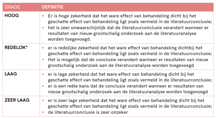 *in 2017 heeft het Dutch GRADE Network bepaald dat de voorkeursformulering voor de op een na hoogste gradering ‘redelijk’ is i.p.v. ‘matig’