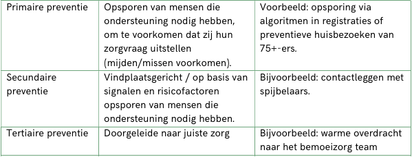 Een belangrijk aandachtspunt is volgens de werkgroep wat er onder preventie wordt verstaan en wanneer dit nog binnen de verantwoordelijkheid van de verpleegkundige en verzorgende in de eerste lijn ligt. Het volgende onderscheid kan worden gemaakt: