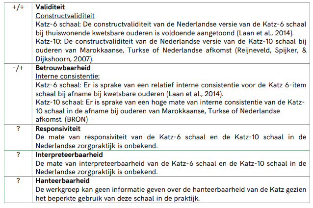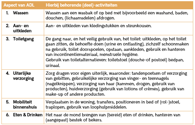 Om tot een werkbare afbakening van het concept ADL te komen, zijn de elementen van de Katz Schaal (5-Items) (Sidney Katz, 1983) en Barthel Index (10-items) (Collin, Wade, Davies, en Horne (1988a) als uitgangspunt gebruikt. Deze ADL-aspecten zijn door de werkgroep aangevuld en geconcretiseerd. Dit heeft geresulteerd in onderstaande afbakening.