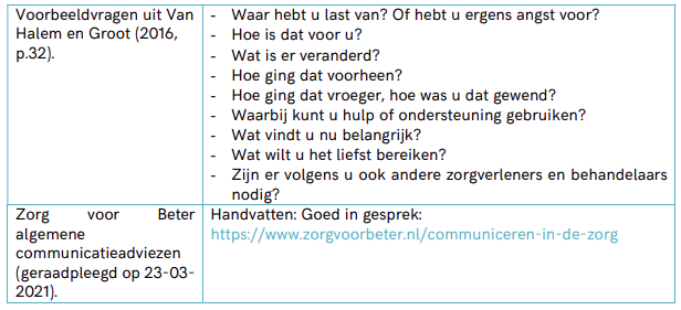 Van Halem en Groot (2016, p.34) en het Kennisplein Zorg voor Beter bieden inhoudelijke voorbeeldvragen aan die de zorgverlener samen met de zorgvrager kunnen gebruiken in de bespreking van het ADL-zorgproces.